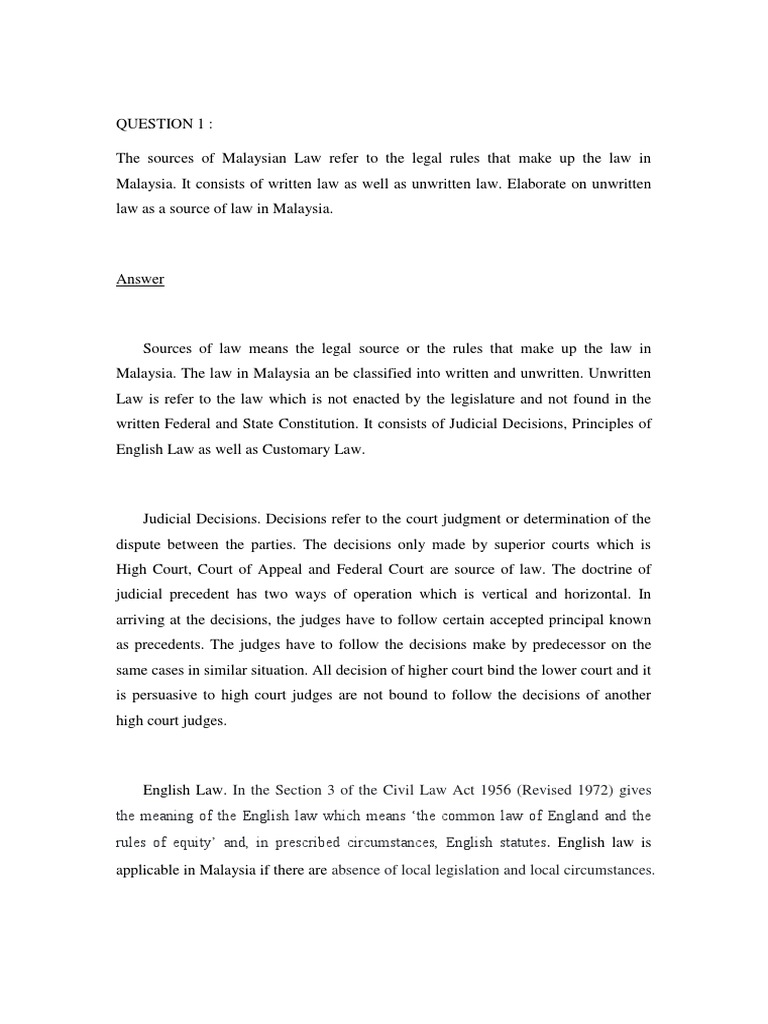 Answer sources of malaysian law sources of law mean the legal rules that make up the law in malaysia which can be classified into written and unwritten law.