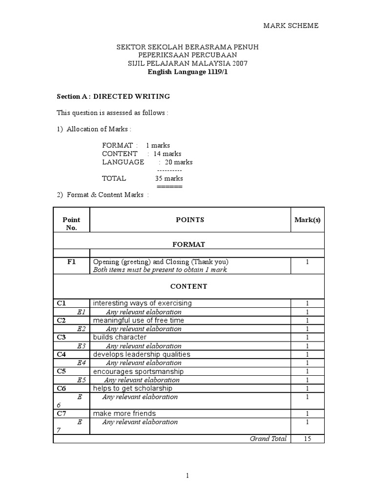 Bi1 English Language 1119 Mark Scheme For Paper 1 Spm Trial Examination 2009 Question 1 Directed Writing 35 Marks A Www Banksoalanspm Com B Format 3 Course Hero