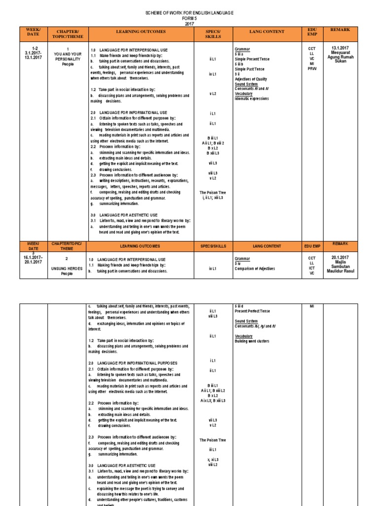 Scheme Of Work For English Language Form 5 2017 1 2 3 1 2017 13 1 2017 13 1 2017 Mesyuarat Agung Rumah Sukan Second Language Conversation