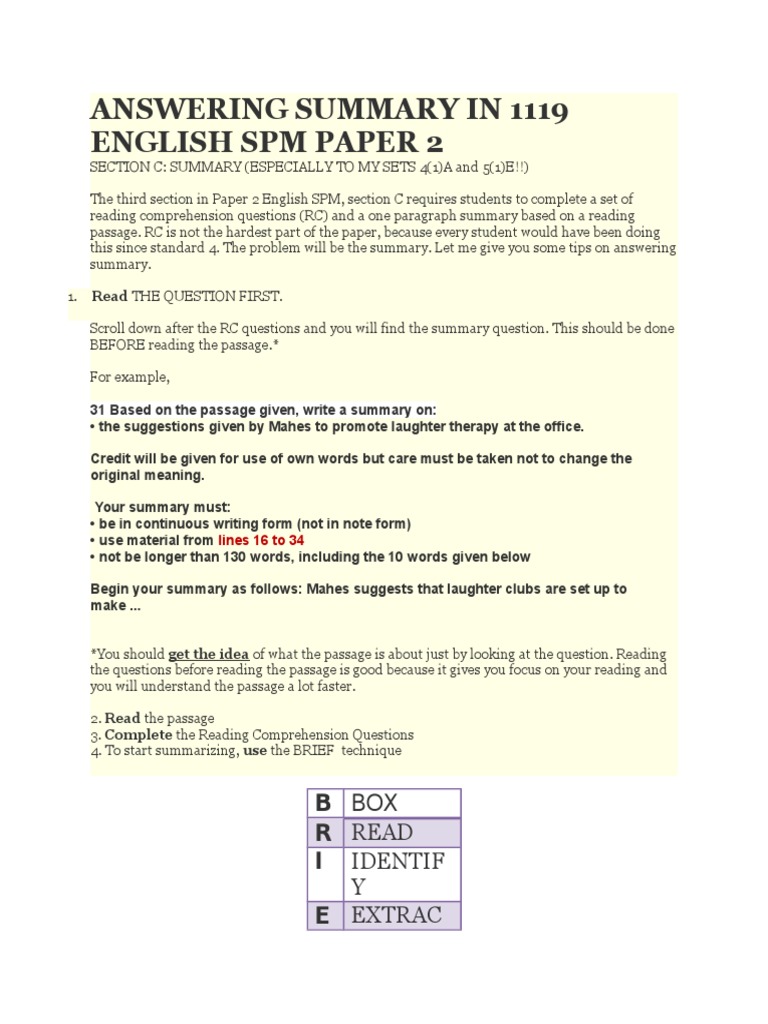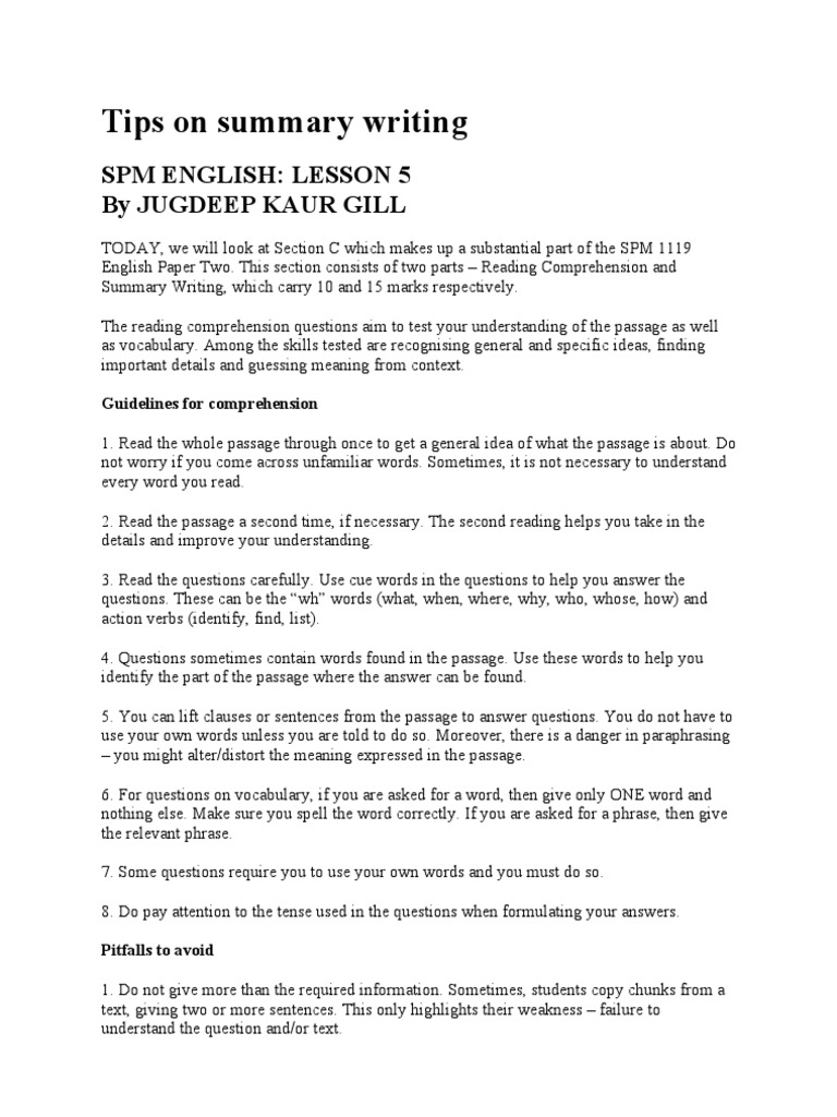 Well here s an extensive list of compiled trial papers from different states for various subjects with answers included. Summary writing skills for spm section c. The purpose of summary writing is to to give basic ideas of the original writing.