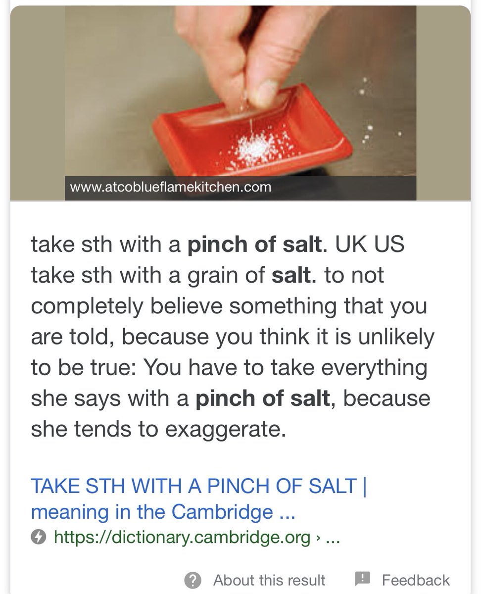 From longman dictionary of contemporary english take something with a pinch of salt take something with a pinch of salt believe used to say that you should not always completely believe what a particular person says you have to take what he says with a pinch of salt. Take with a grain of salt and take with a pinch of salt are two idioms which has the same meaning. To take something with a pinch of salt definition.